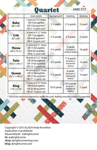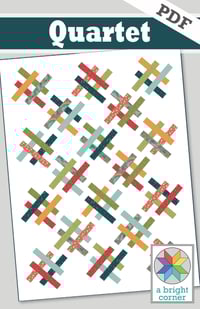 Quartet is a precut friendly pattern that uses 2 ½” strips, fat eighths, fat quarters, or yardage (¼ yard cuts). Quartet includes six size options: baby, crib, throw, twin, queen, king.